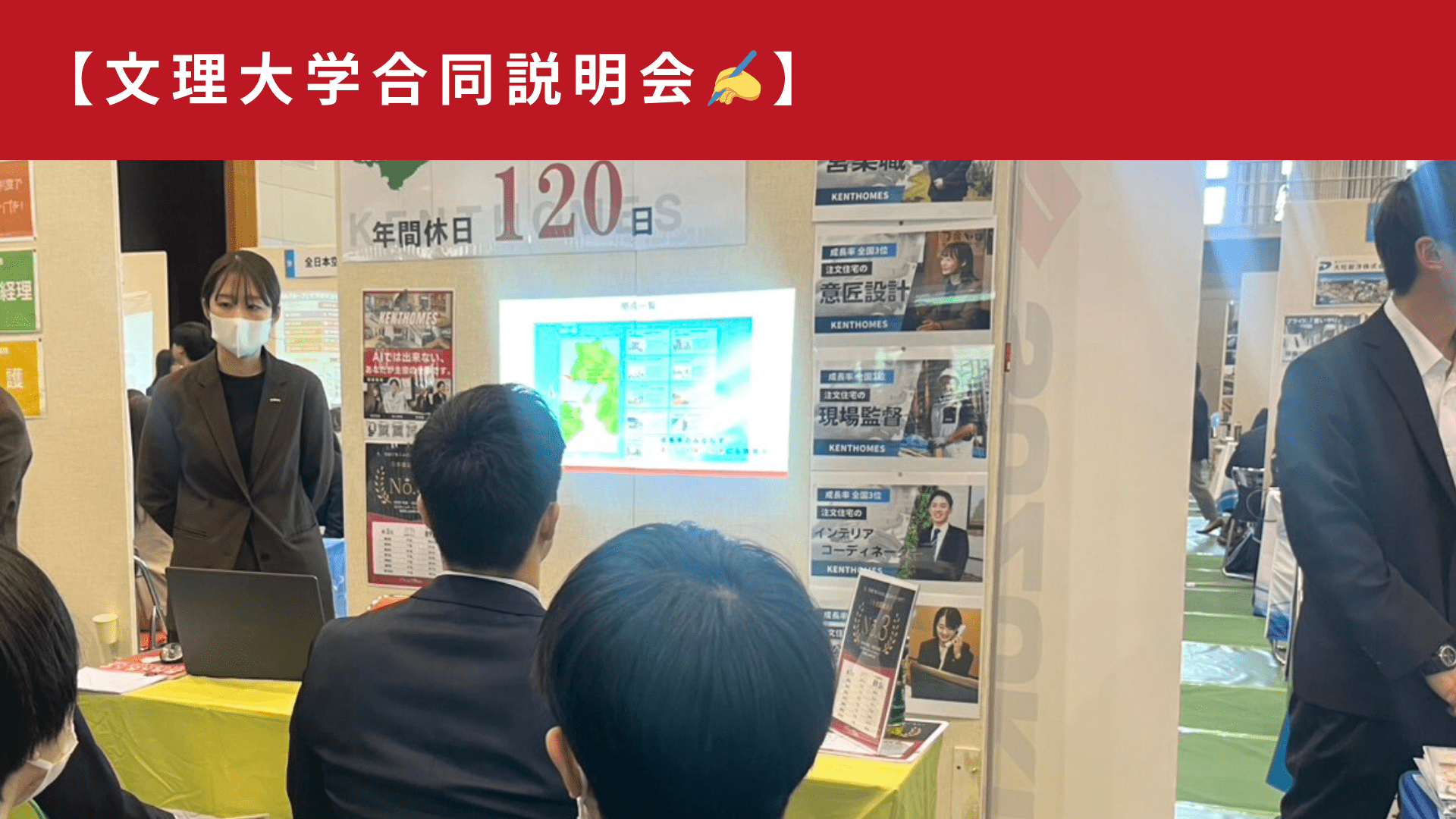 こんにちは!採用担当のまつうらです。先日、徳島文理大学さんで開催された「合同企業説明会」に参加しました! 当日は300名を超える学生さんが参加し、たくさんの方と交流ができました🏠 ケントホームズではまだまだ2027年新卒採用を実施しておりますので気になる方はぜひエントリーください😊 \ Share ! /